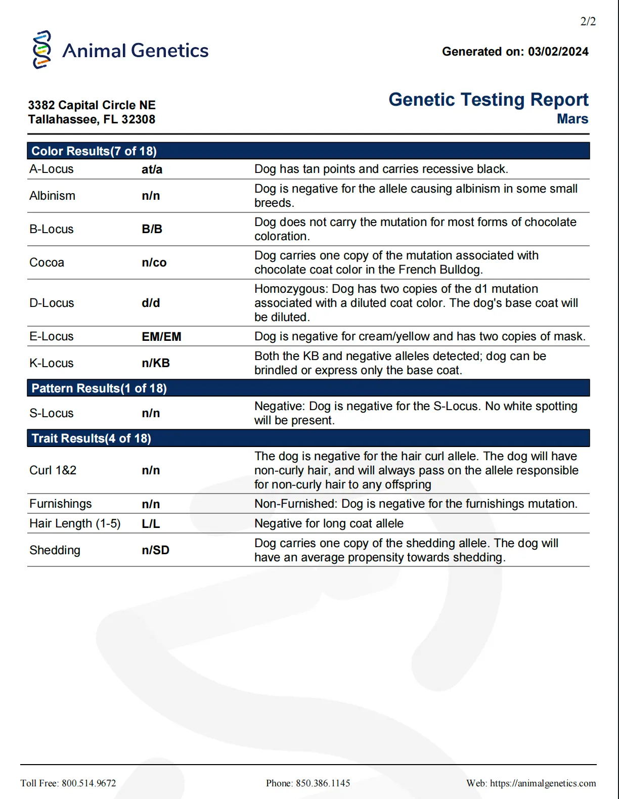 Mars is a top-quality Blue Tan male, 2 years old, located in Atlanta, Georgia (GA). With a strong genetic profile (At/A, B/B, N/Co, D/D, EM/EM) and excellent overall health, he is a powerful choice for producing healthy, vibrant litters with rare and desirable color potential.
