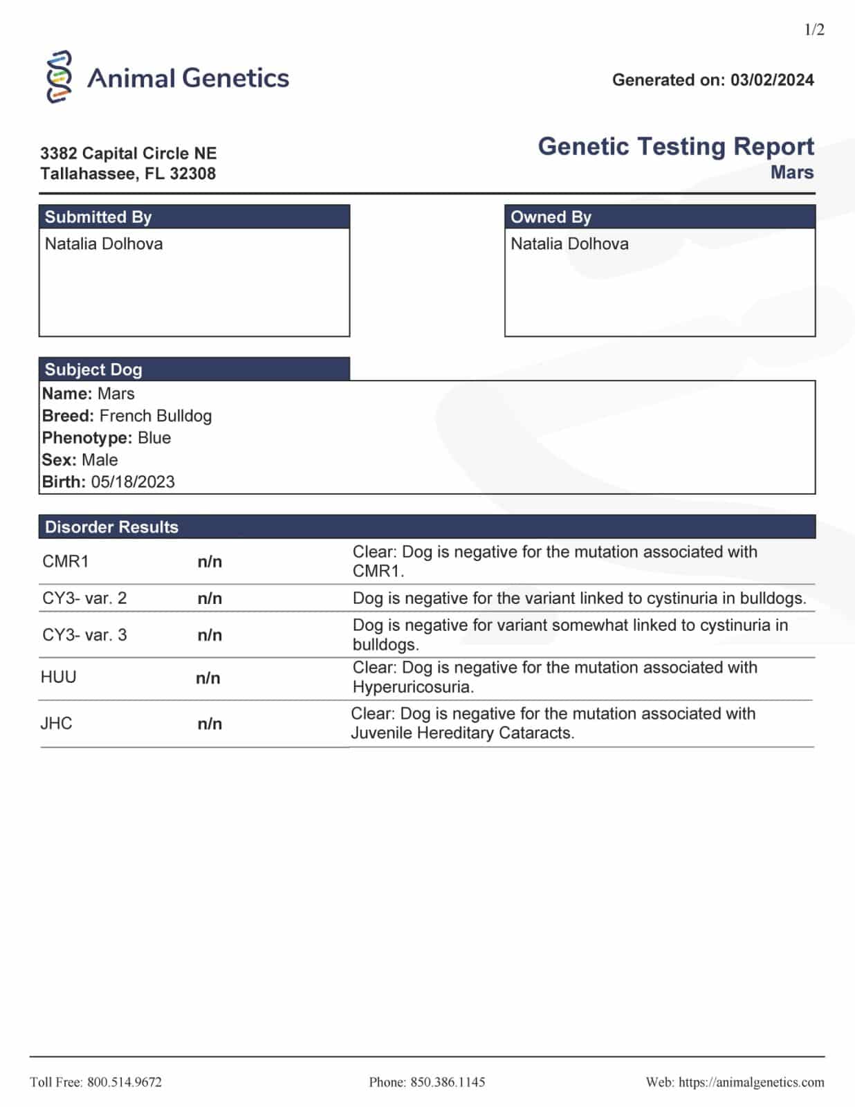 Mars has a confident, balanced temperament — friendly, stable, and easy to handle — making him an ideal match for professional and hobby breeders alike. His bloodline is respected for structure consistency, great head type, compact proportions, and overall breed excellence.