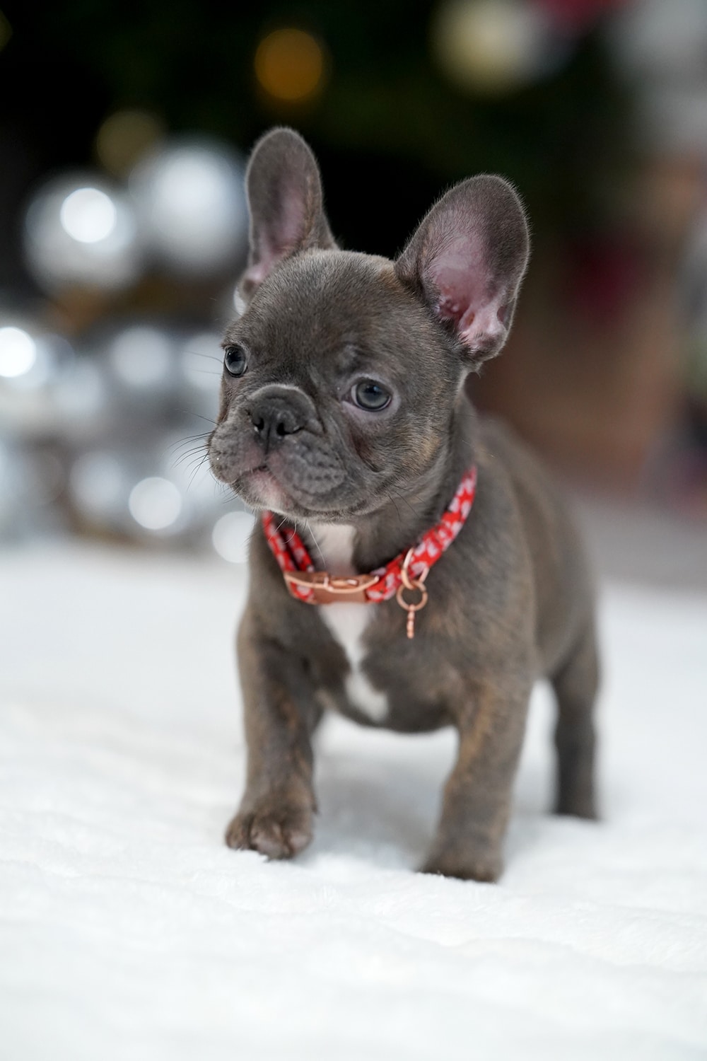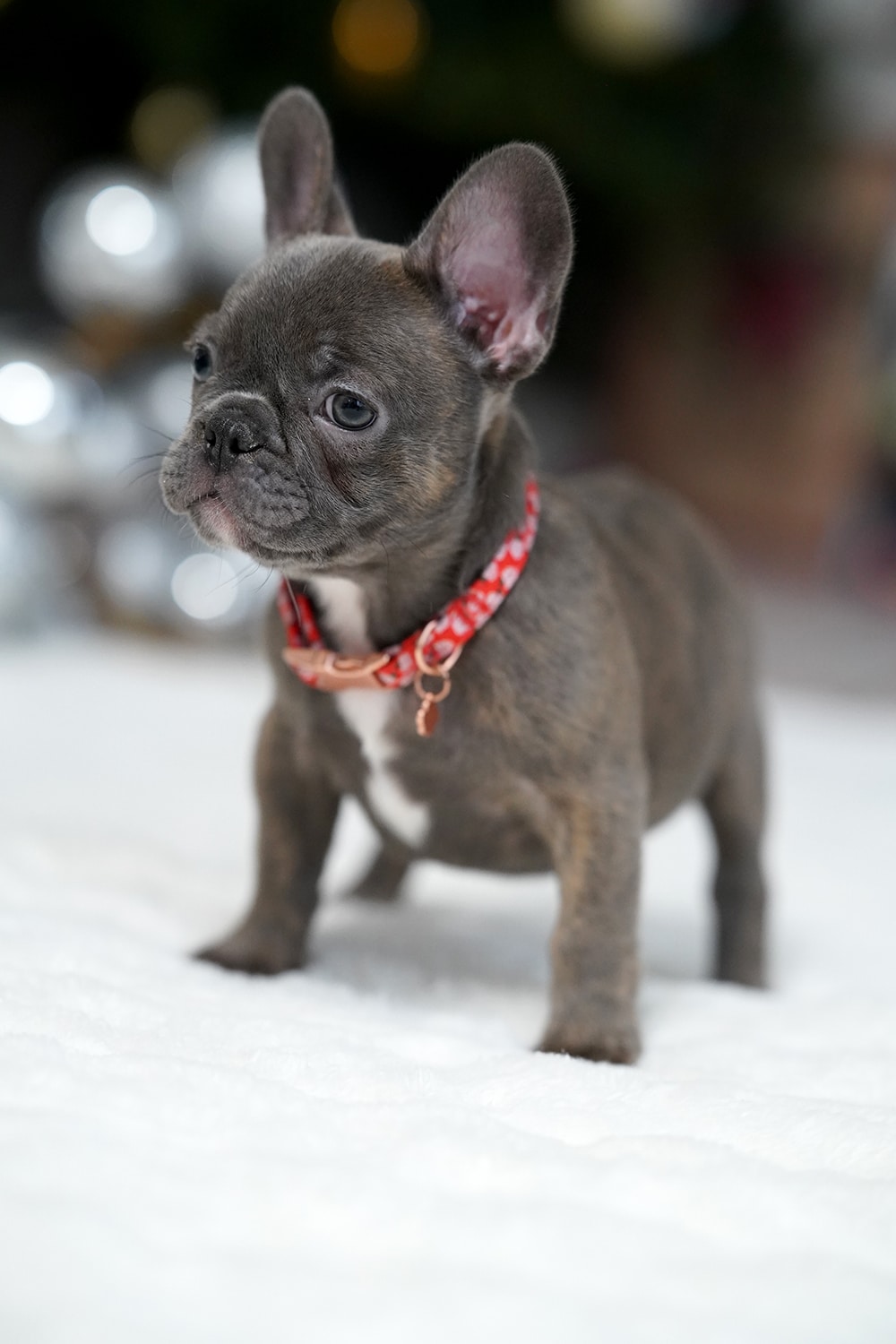 A fully mature Female French Bulldog typically develops a slightly finer structural elegance, with an expected weight range of 17 to 24 pounds and a standing height of 11–12 inches. She is expected to maintain a soft but robust physical build.