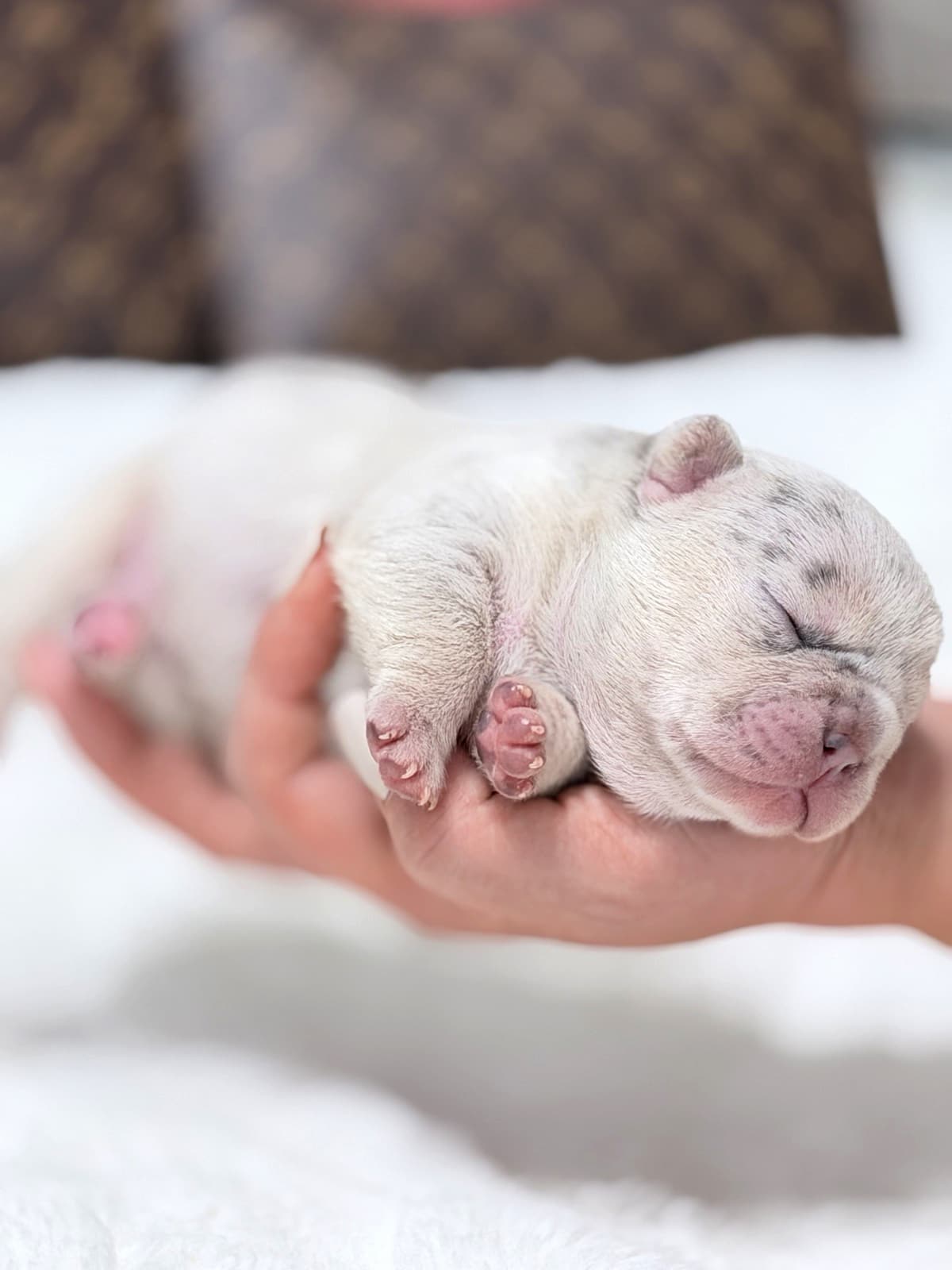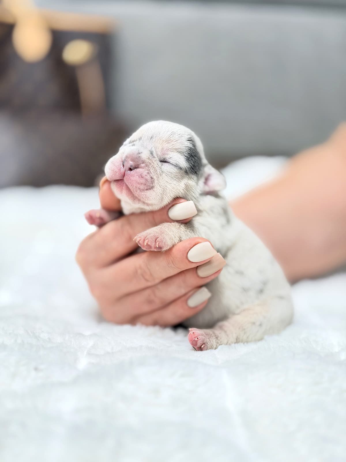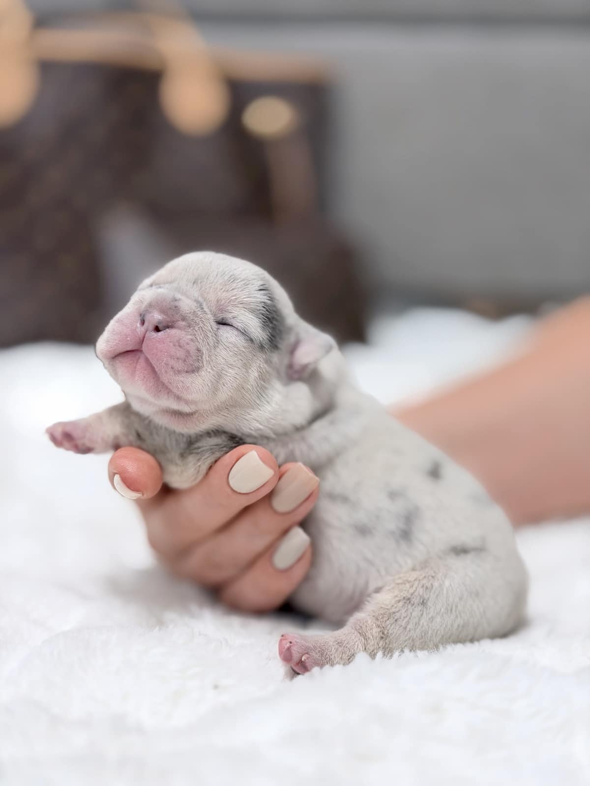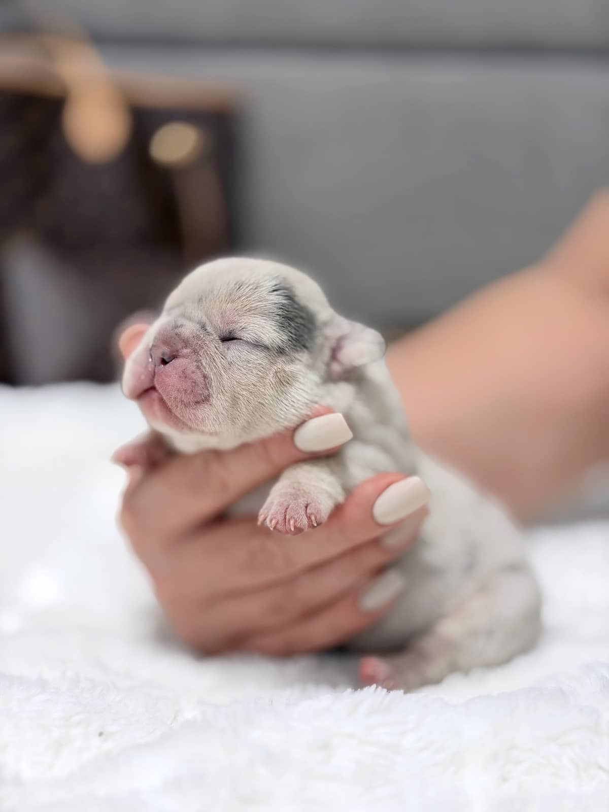 This elegant Female Blue Merle French Bulldog is a charming family addition with a gentle, balanced nature. Raised in a nurturing home atmosphere, she is perfectly socialized with children and other pets. Her adaptable personality makes her an ideal companion, whether you reside in a chic city apartment or a grand private estate.