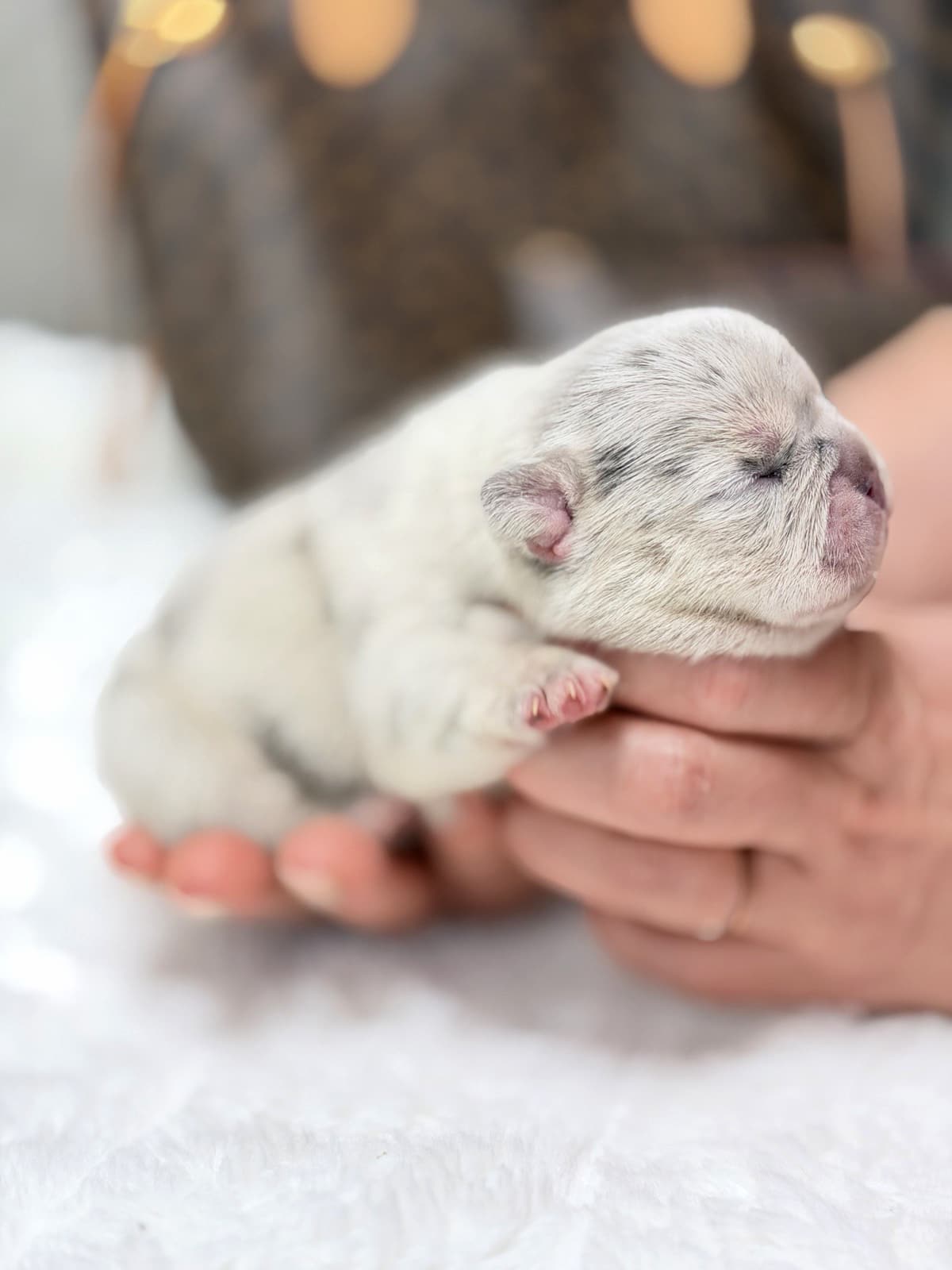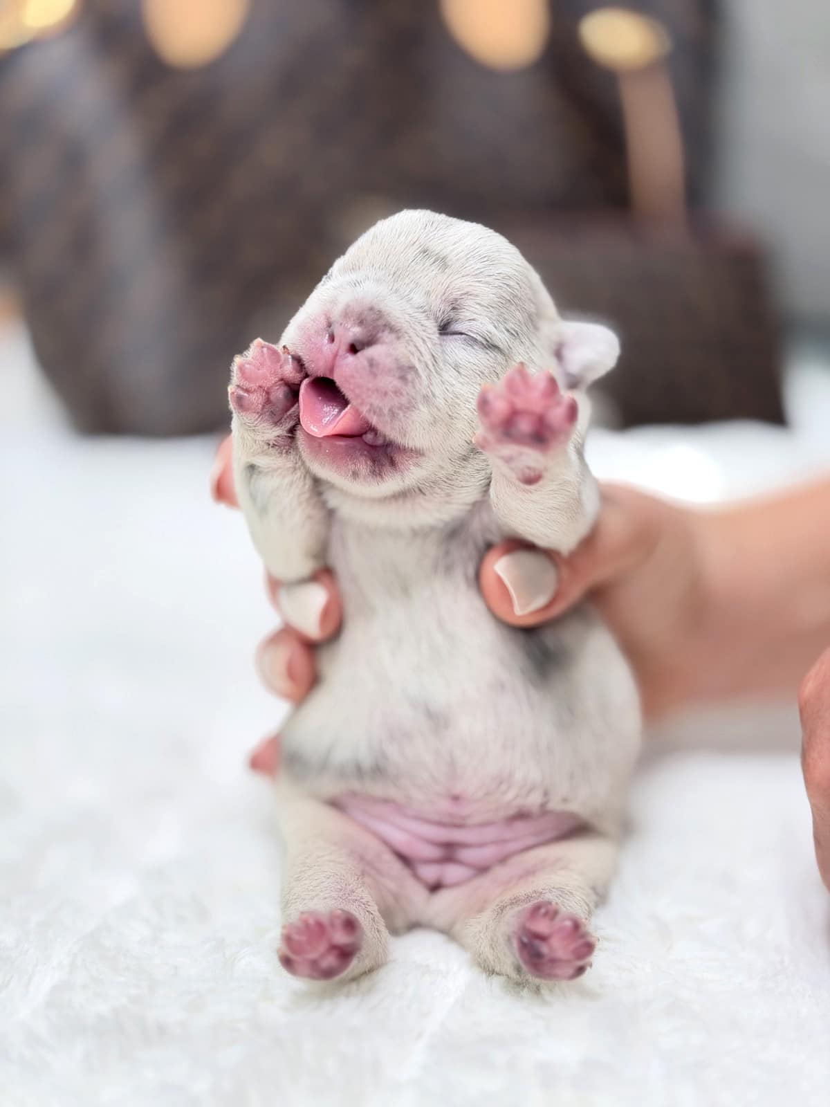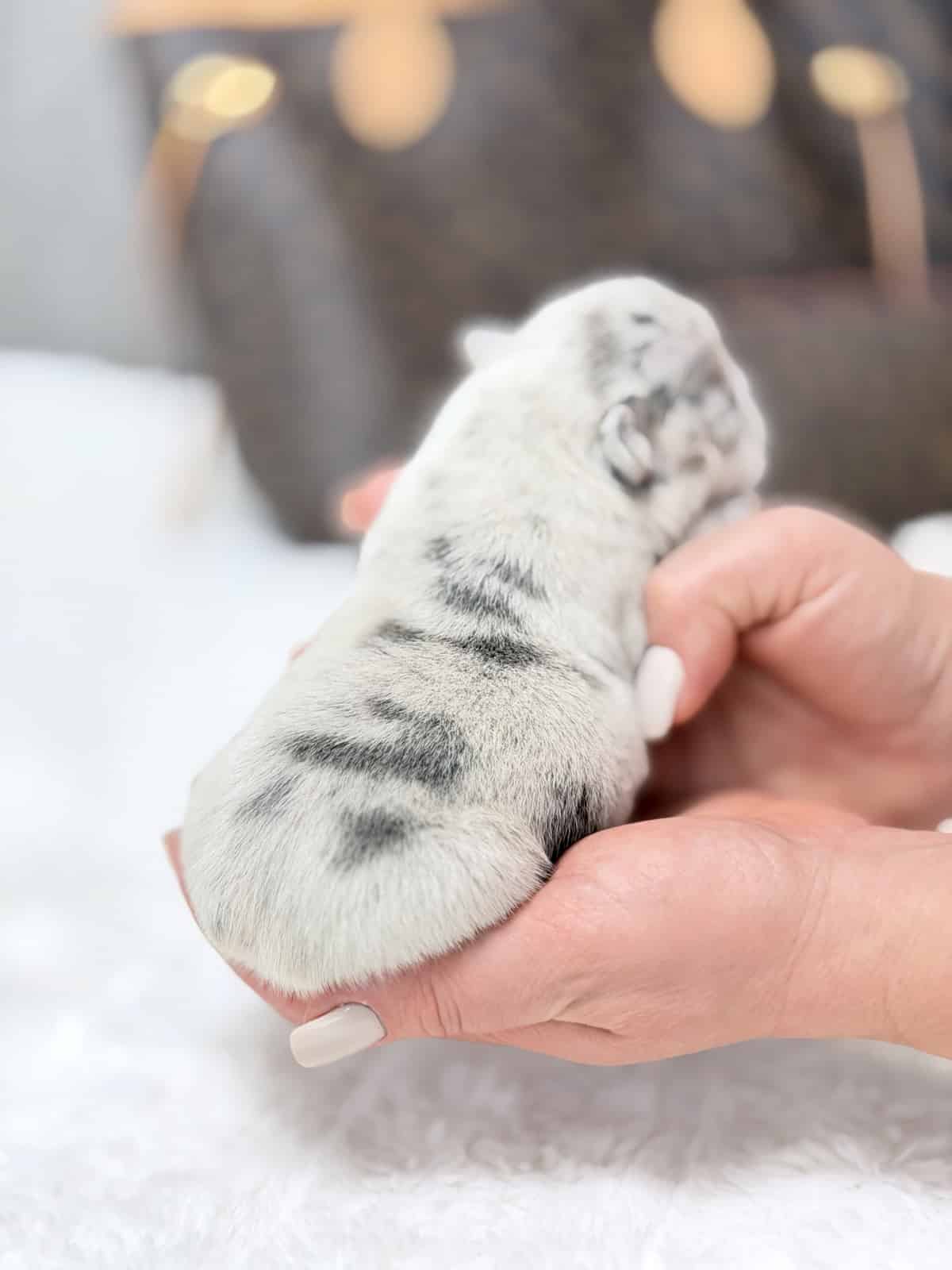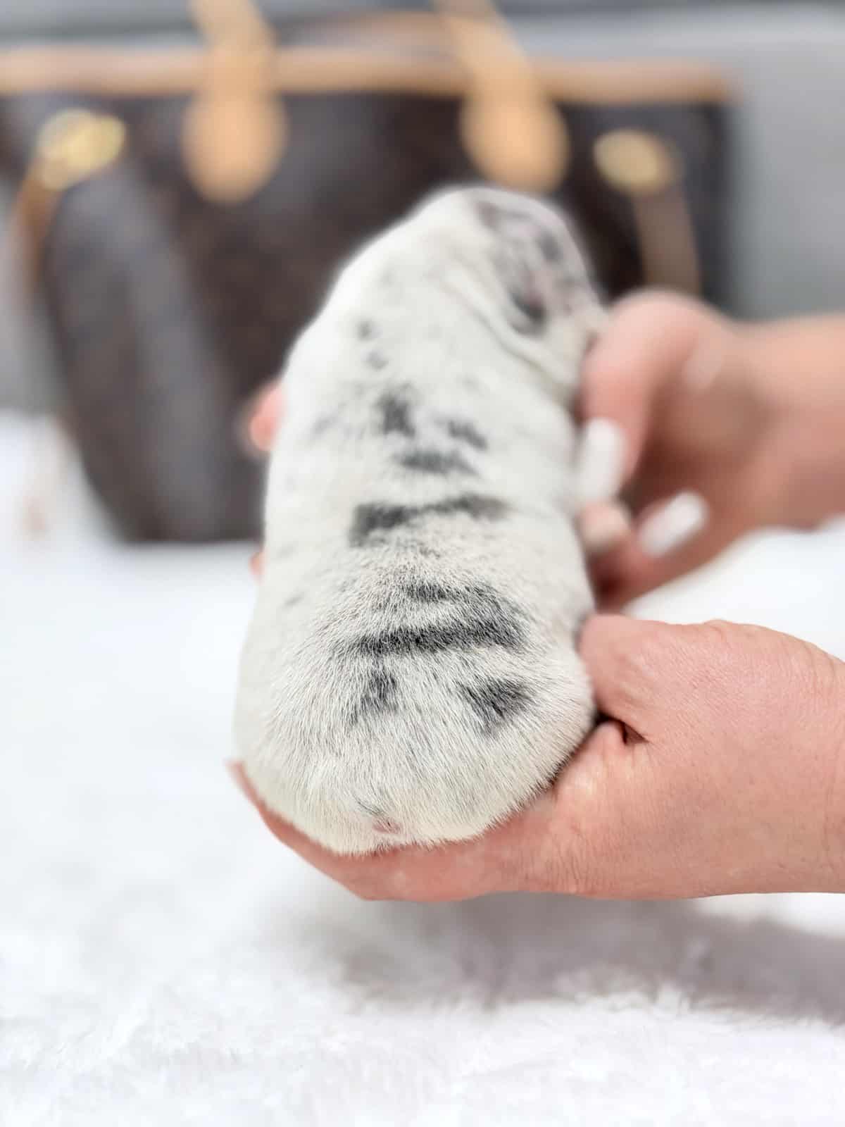 This stunning Female Blue Merle French Bulldog is a loyal family companion with a gentle, sweet disposition. Raised within a loving home atmosphere, she is exceptionally socialized with kids and other domestic animals. Her flexible nature makes her a perfect companion for those living in urban apartments or luxurious country estates.