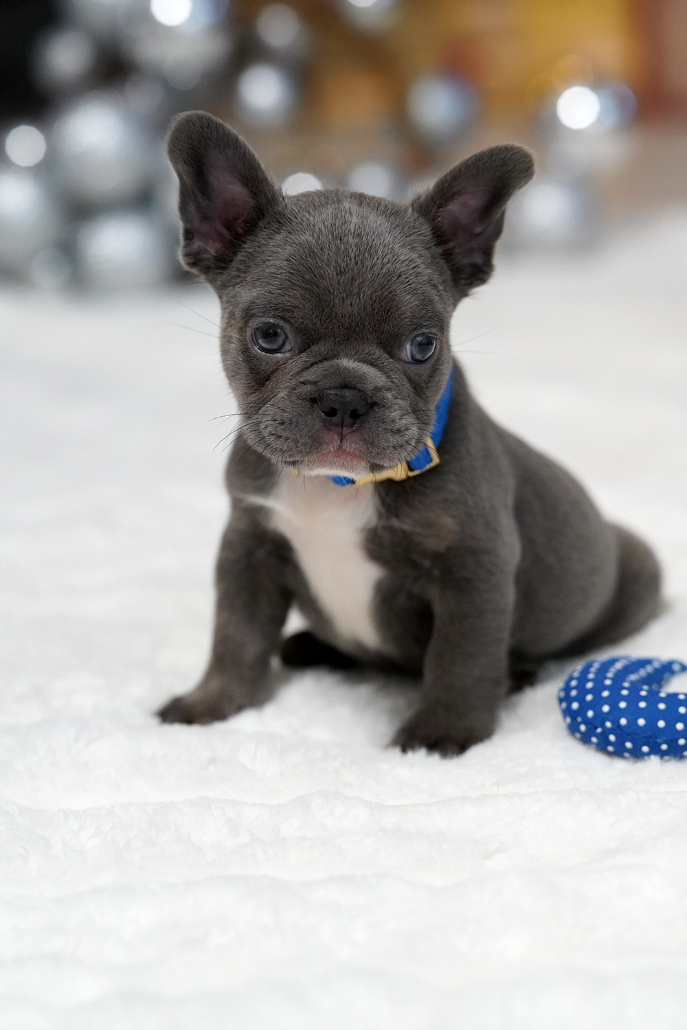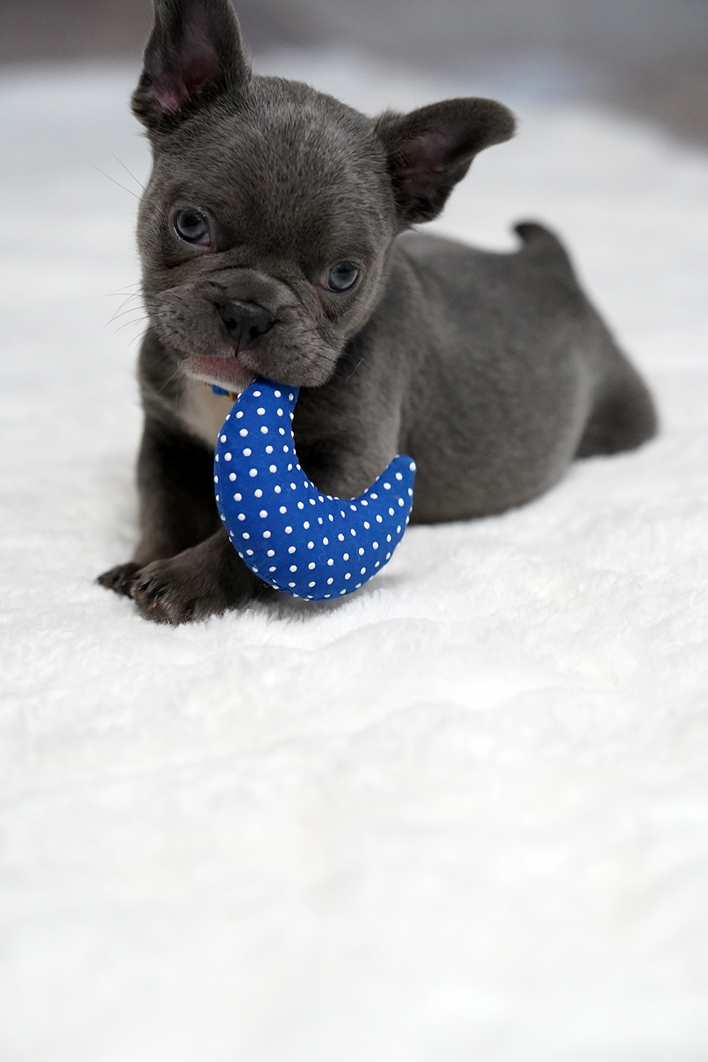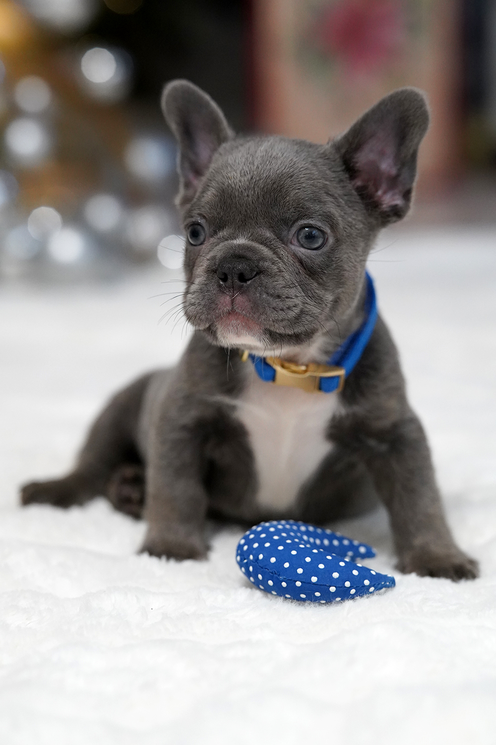 Puppy’s Personality This Male Blue French Bulldog is a gentle companion known for his sweet nature and intelligence. Raised as a part of our family, he is exceptionally well-socialized with children and other dogs. His adaptable spirit makes him a perfect match for urban apartments or spacious country estates alike.